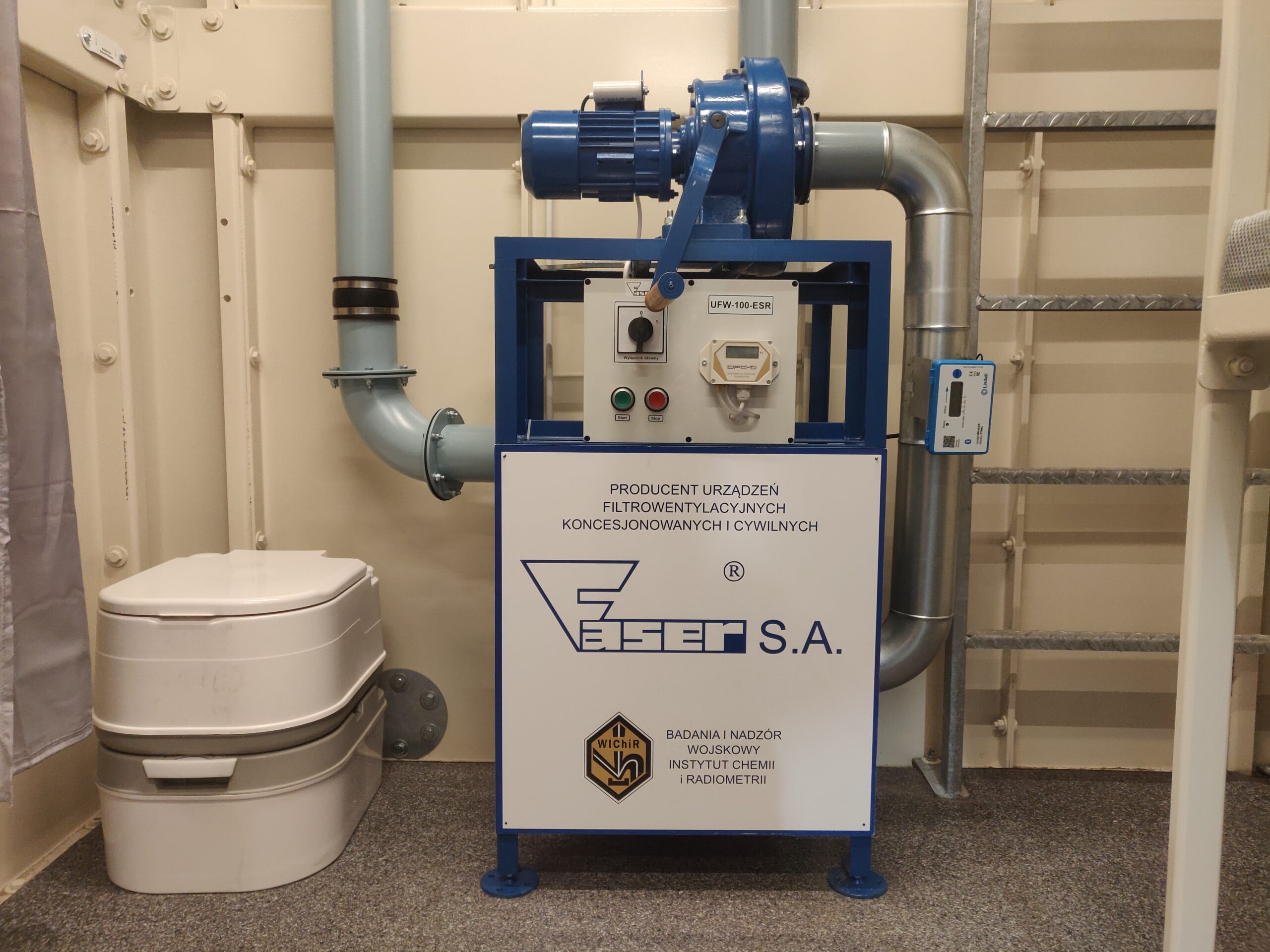 Urządzenie UFW-100-ESR przeznaczone jest do dostarczania powietrza oczyszczonego ze skażeń do cywilnych schronów stacjonarnych lub do innych obiektów cywilnych. Urządzenie wytwarza nadciśnienie przeciwdziałające przedostawaniu się skażeń do wnętrza schronu przez ewentualne nieszczelności.